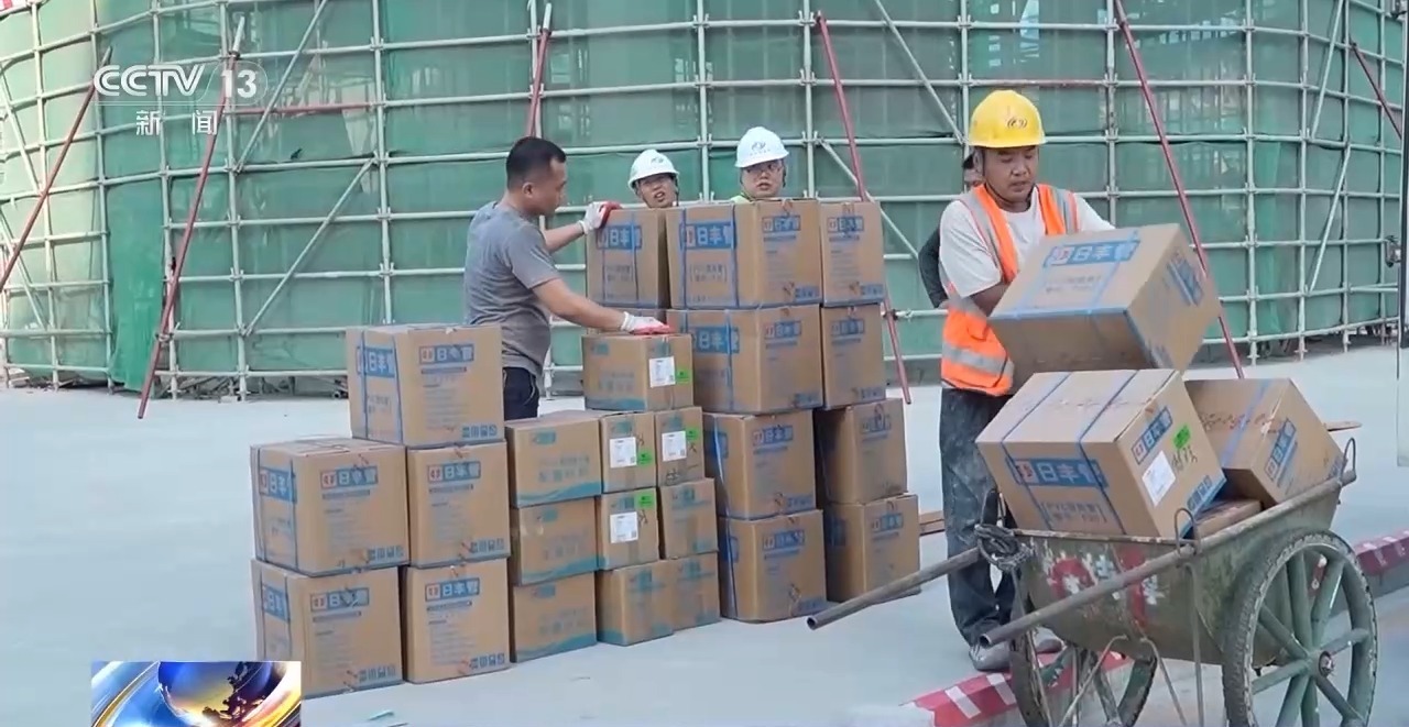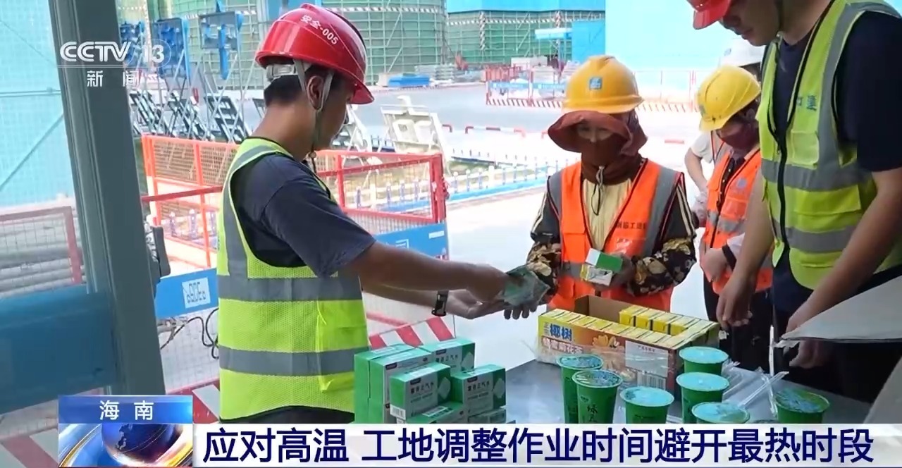 总台记者 金歆竹:在海口的一处施工现场,虽然现在是下午的5点30分左右,但是天气预报显示现在仍然是35℃左右。施工现场也为工人们提供了清凉解暑的饮品以及药品。