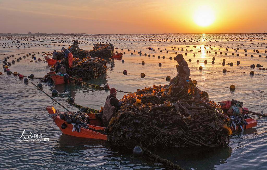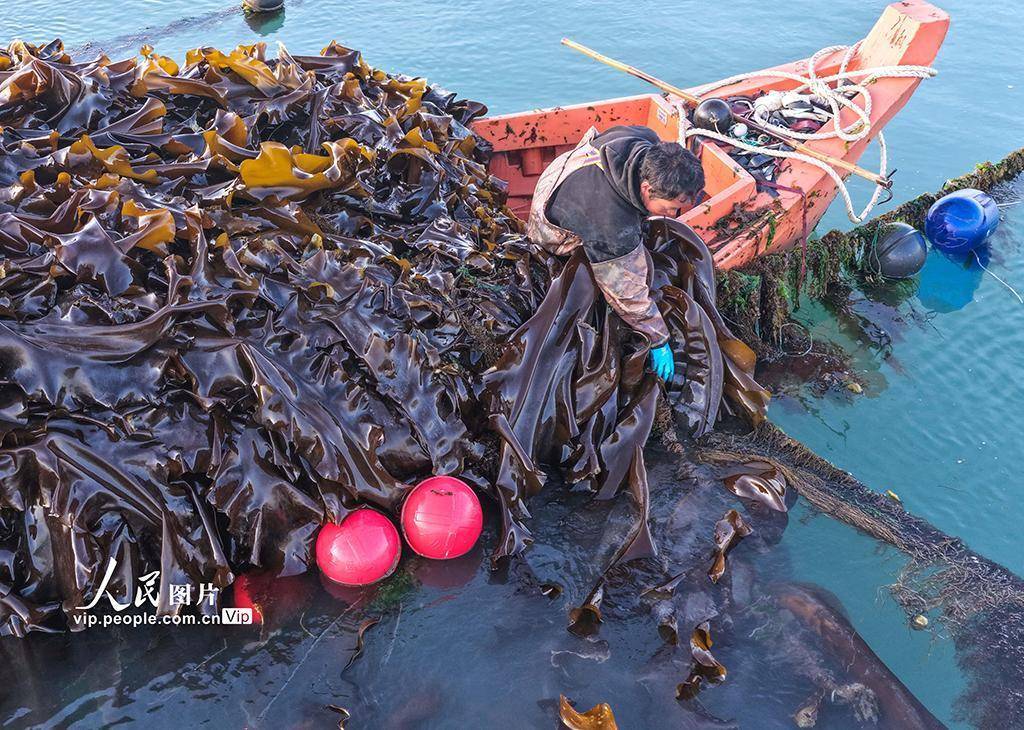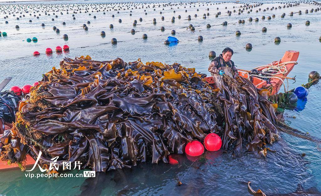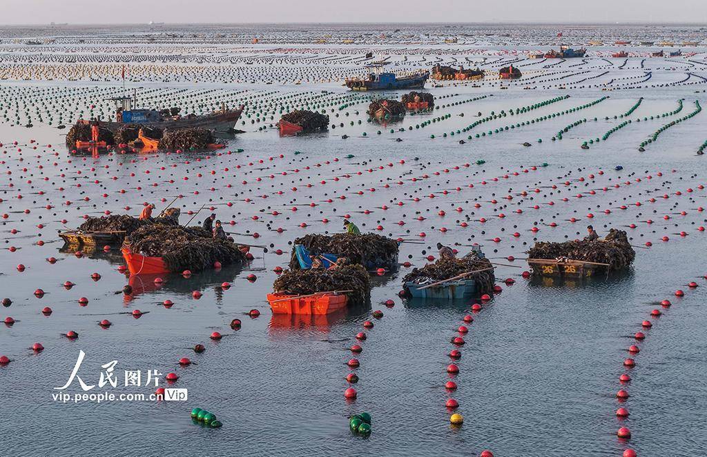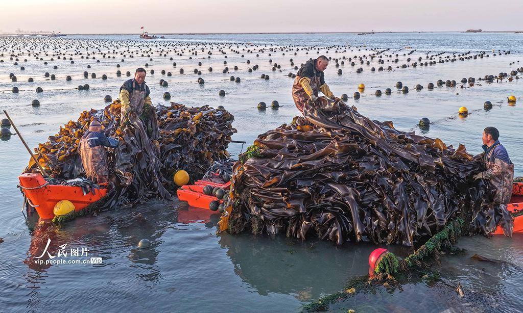 2026年4月21日,山东荣成市爱伦湾海洋牧场海带养殖区,养殖工人正加紧采收海带,供应市场。李信君摄(人民图片网)