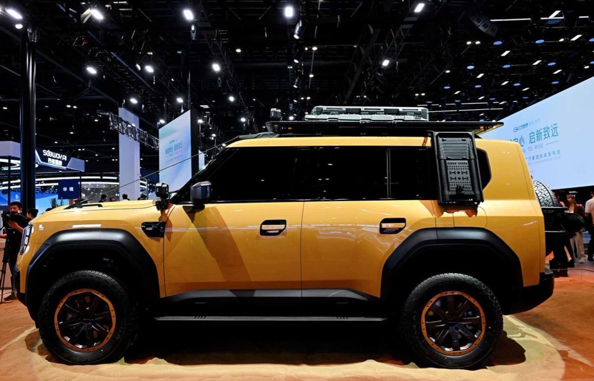 这次展台上亮相的越7是官方定制改装版本,加了不少东西:射灯套装(前杠+A柱+车顶)、锐化机盖、雨林分割线、亮黑轮眉、锻造轮毂、18寸AT胎、抽拉式车顶平台、侧边帐、多功能侧爬梯、侧挂油桶支架、备胎拓展支架、装备箱、脱困板、工兵铲。