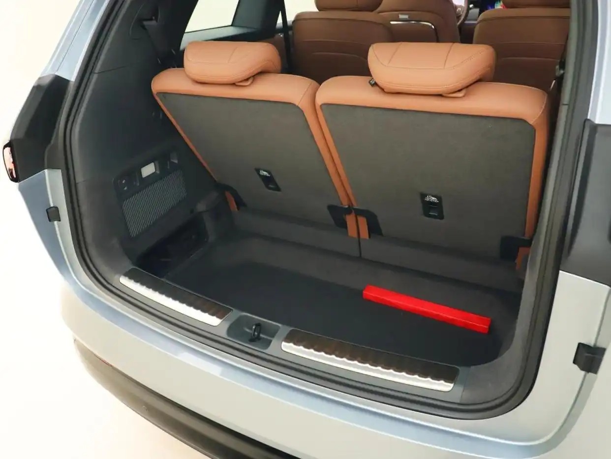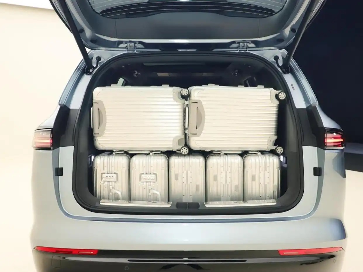 多座SUV最大的尴尬:能坐就不能装。这台车配双层下沉式后备箱,满员6人状态下后备厢容积423L,实测能放下7个20寸行李箱。三排放倒后1268L,四人出行直接空出一间房。钓鱼竿包也能横着放。